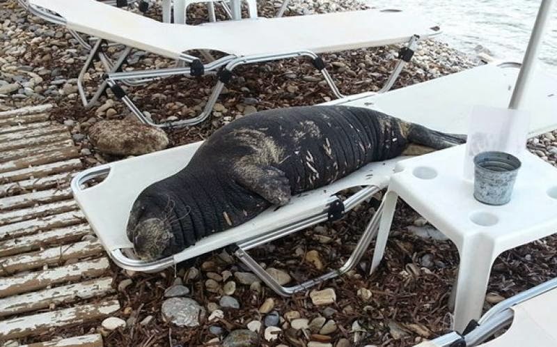 Μία ευχάριστη έκπληξη περίμενε σήμερα το πρωί τους λουόμενους στην παραλία της Γάγκου στη Σάμο, καθώς η μικρή φώκια που τους τελευταίους μήνες παρουσιάζεται σε διάφορες περιοχές του νησιού εθεάθη για πρώτη φορά ξαπλωμένη σε... σεζλόνγκ.